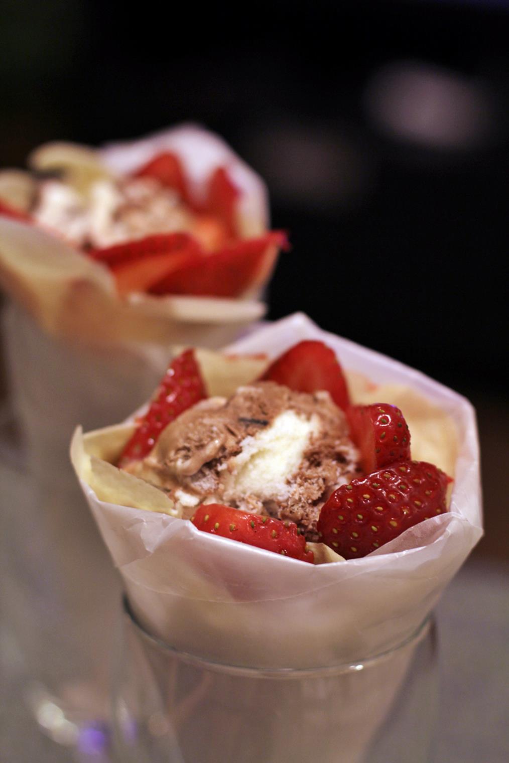 Add sliced strawberries and whipped cream or nutella in a quarter of the pancake, fold it, add one scoop of ice cream on top. And enjoy!