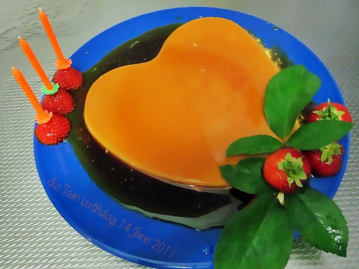 Birthday creme caramel for sis Tam, who is a new but always a good friend to me! Photo taken by her! I broke the cake a bit while travelling to her place. She was clever enough to come up with the rose leaf- idea and make it so beautiful!