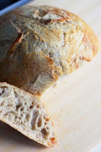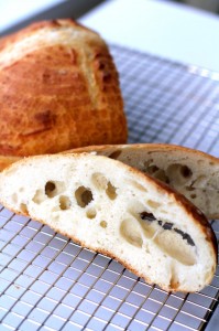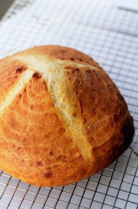Let the bread cool on rack. You should hear the crust crackling. and Yum!!!!!!!!! A and I both agree that freshly baked bread with simple unsalted butter is just pure pleasure.